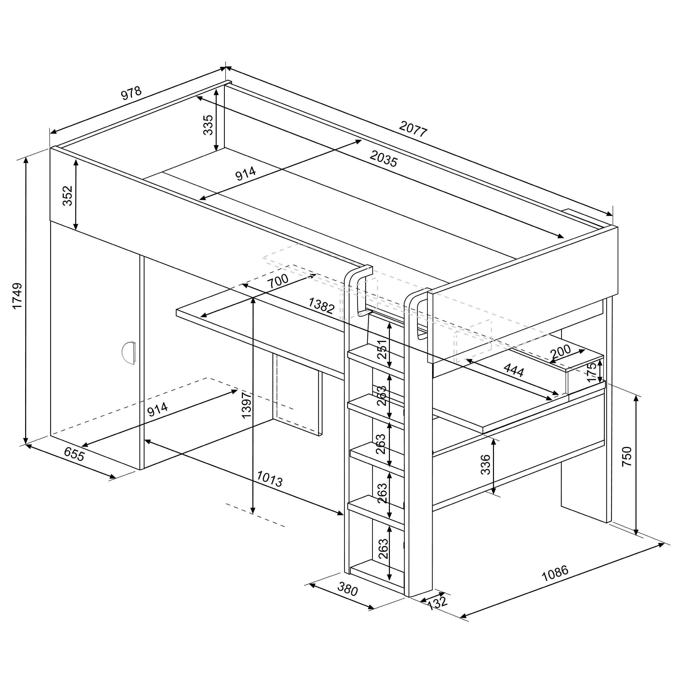 It has a built-in wardrobe with hanging rail for storing garments, plus two large shelves for clothing and footwear. There's a 1.4M wide desk and shelf below the elevated bed, turning the floorspace into a useful area for work, study and leisure. The foot of the bed has a wide shelf, ideal for books, games, footwear and more - all readily displayed and at hand. (The chair shown in not included).