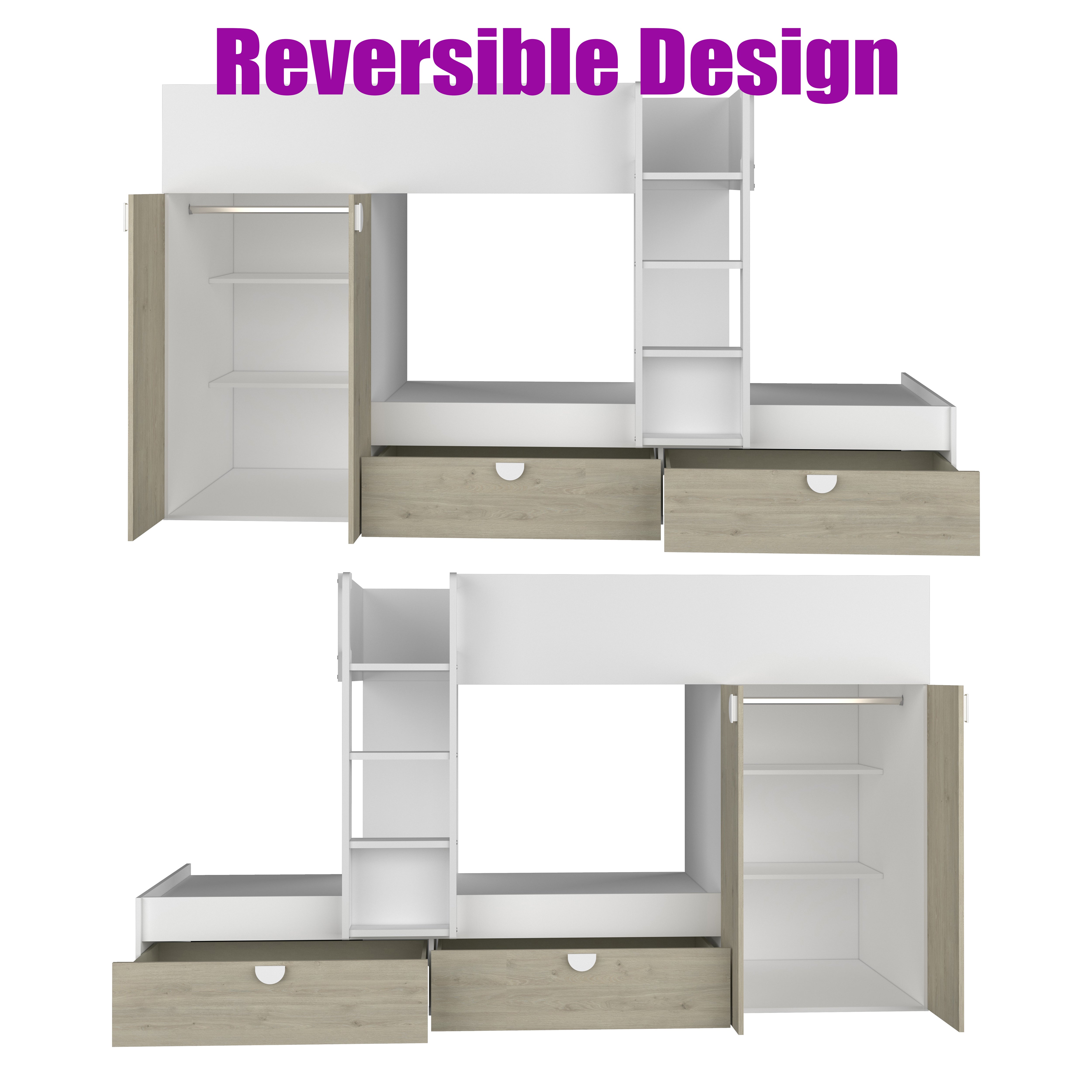 "Reversible" design - can be set-up with wardrobe on the left and lower bed on the right, or the other way round, as you wish (you just choose when getting the bed out to assemble it).