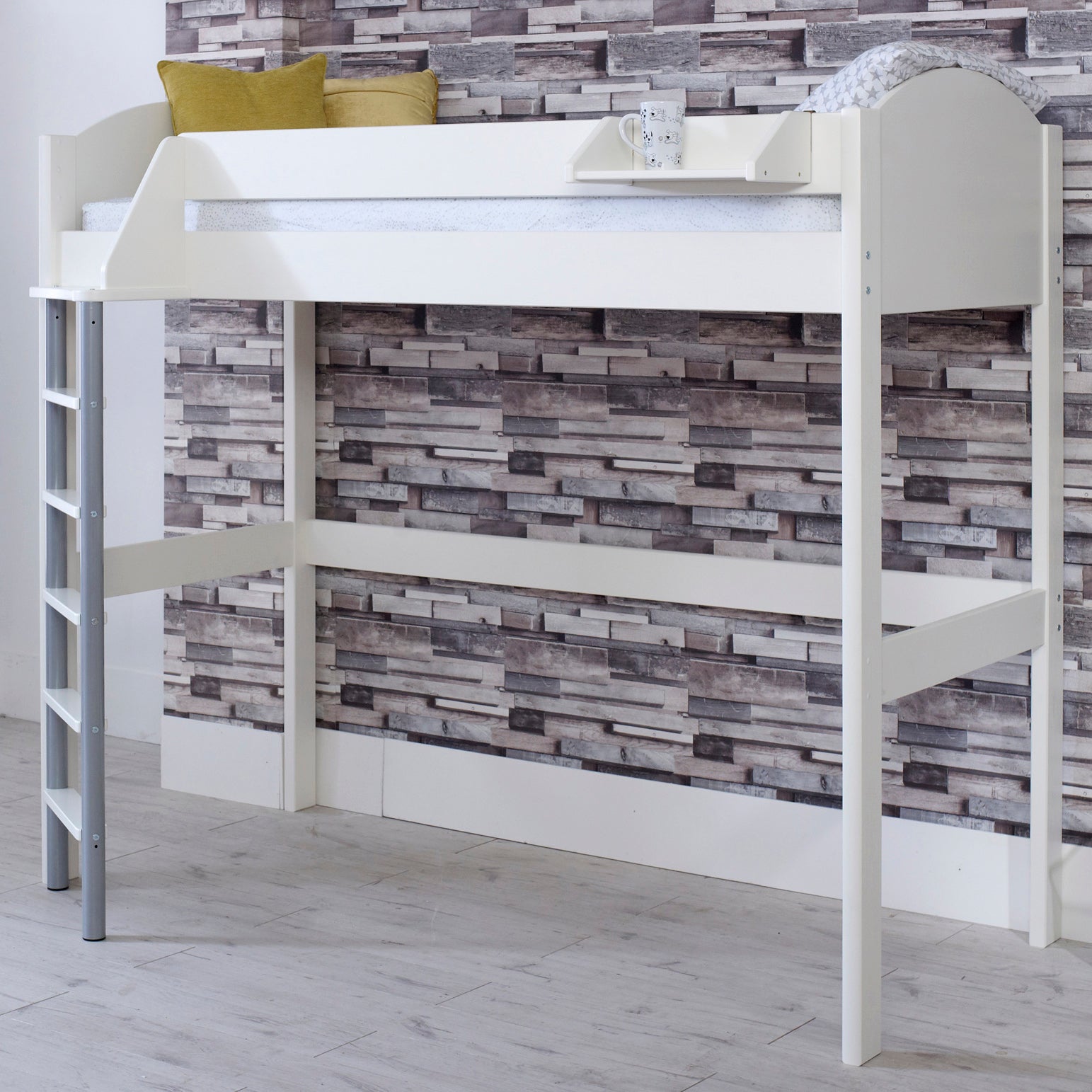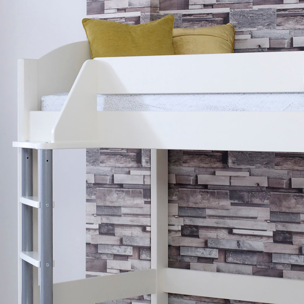 The ladder can be set-up on either end of the bed, as required (mirror image). The bedframe is made from solid Scandinavian pine, in a white finish, and the header and footer boards are made from modern MDF.