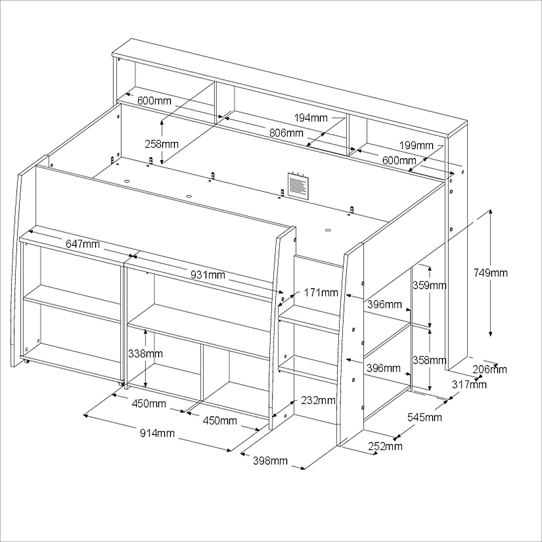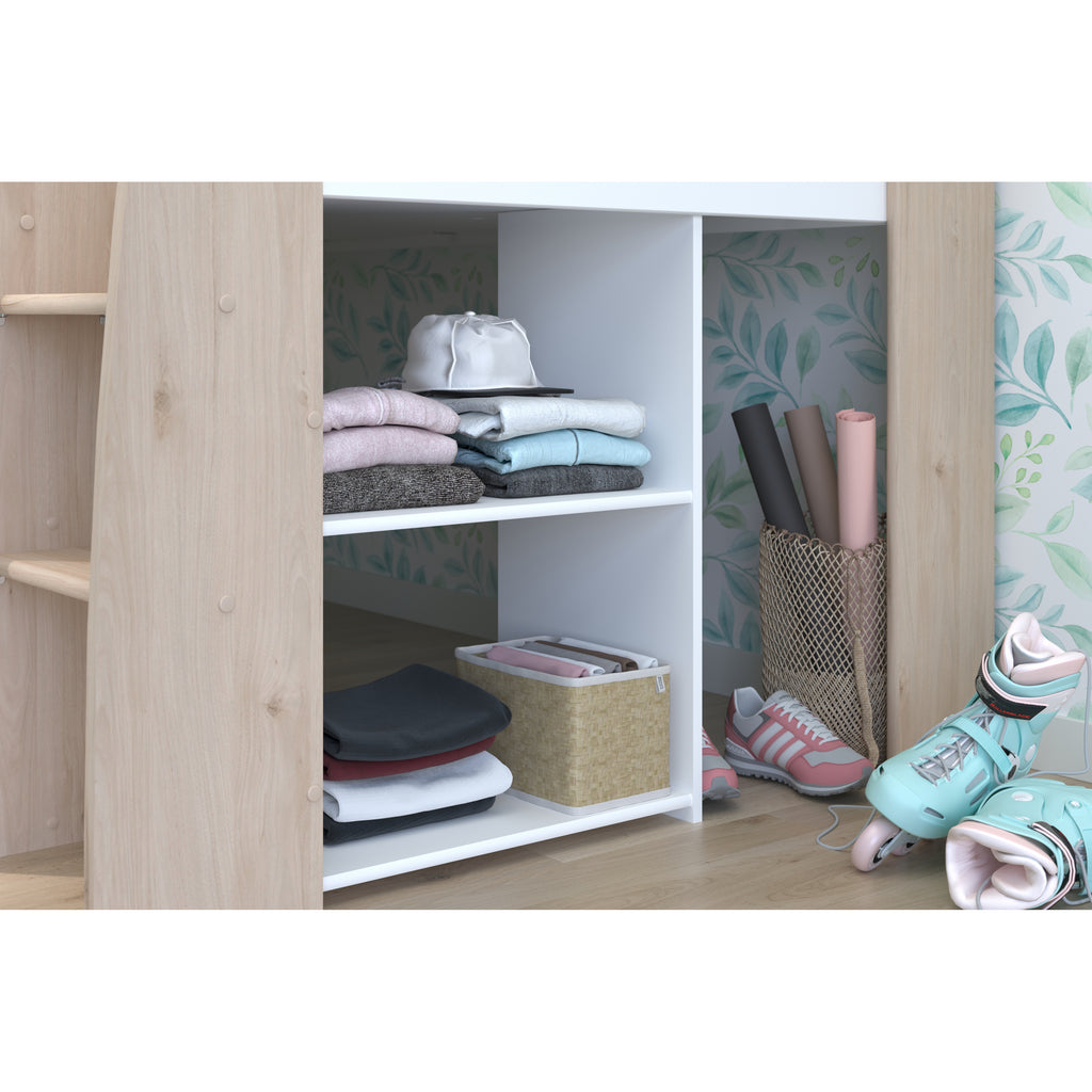 The Parisot Lucas Midsleeper Cabin Bed is cleverly designed to utilise space - ideal for small rooms or to maximize floor space in regular rooms. This new top of the range midsleeper offers useful storage space below the raised bed, via three storage shelving units plus additional room at the base of the bed. There's also a integral desk, ideal for study and play, that simply rolls-out on castor wheels when needed.