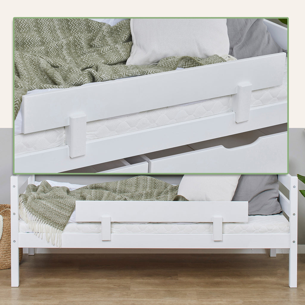 The bed has a full width rail on one side. You can also buy this bed with a shorter 100cm long safety rail on the other side of the bed if required (just select that option when adding to basket). It just slots onto the side of the bed and prevents rolling out.