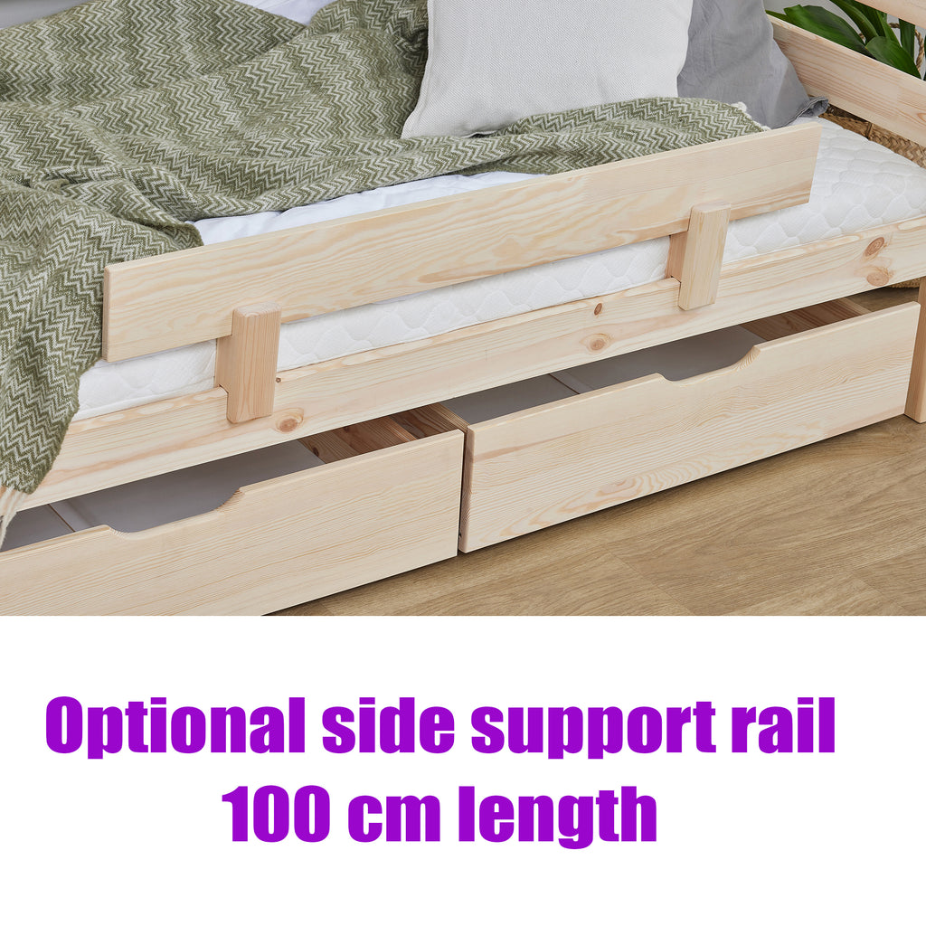 The bed has a full width rail on one side. You can also buy this bed with a shorter 100cm long safety rail on the other side of the bed if required (just select that option when adding to basket). It just slots onto the side of the bed and prevents rolling out.
