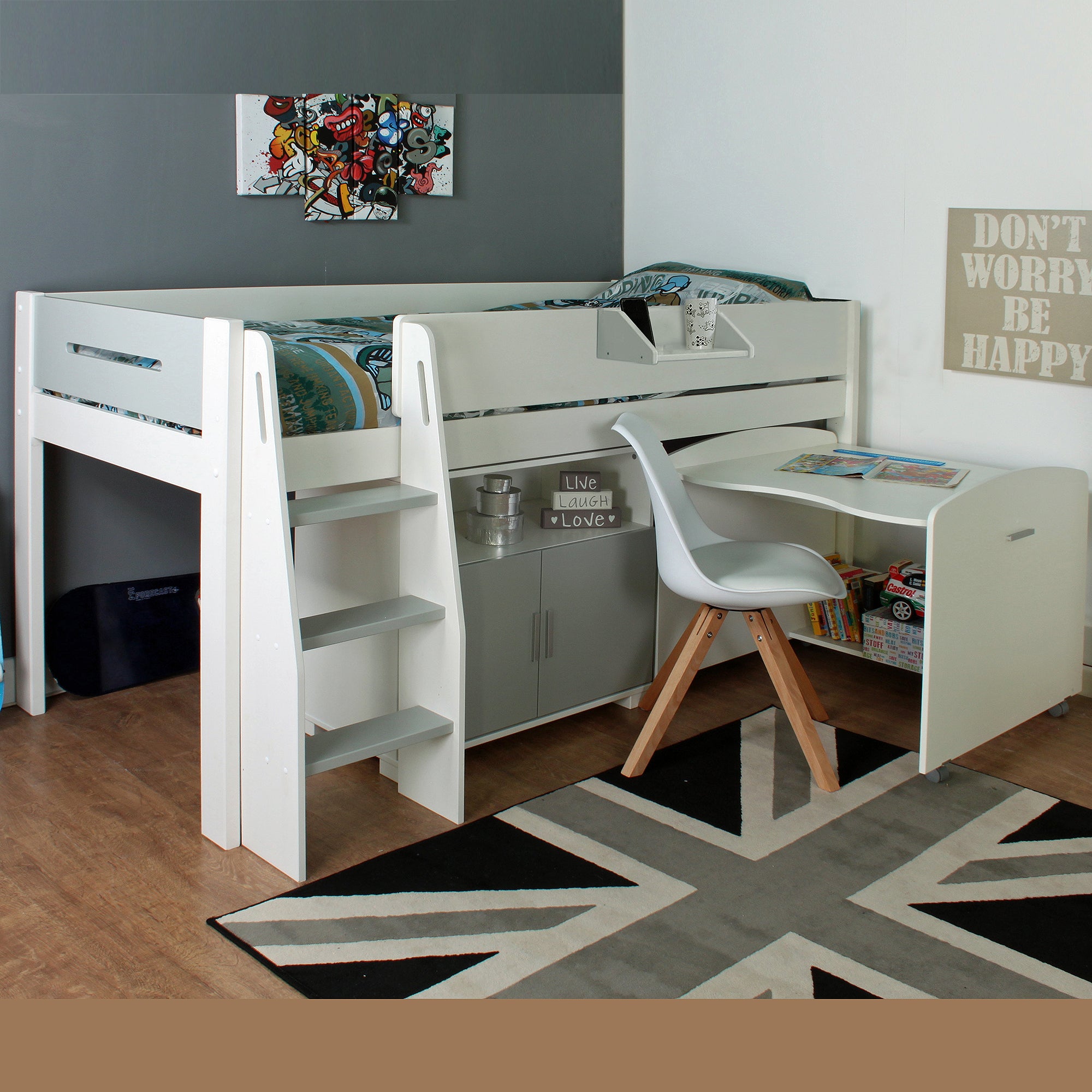 White & Grey Midsleeper 2 with Pull Out Desk & Cupboard - Kids Avenue Urban