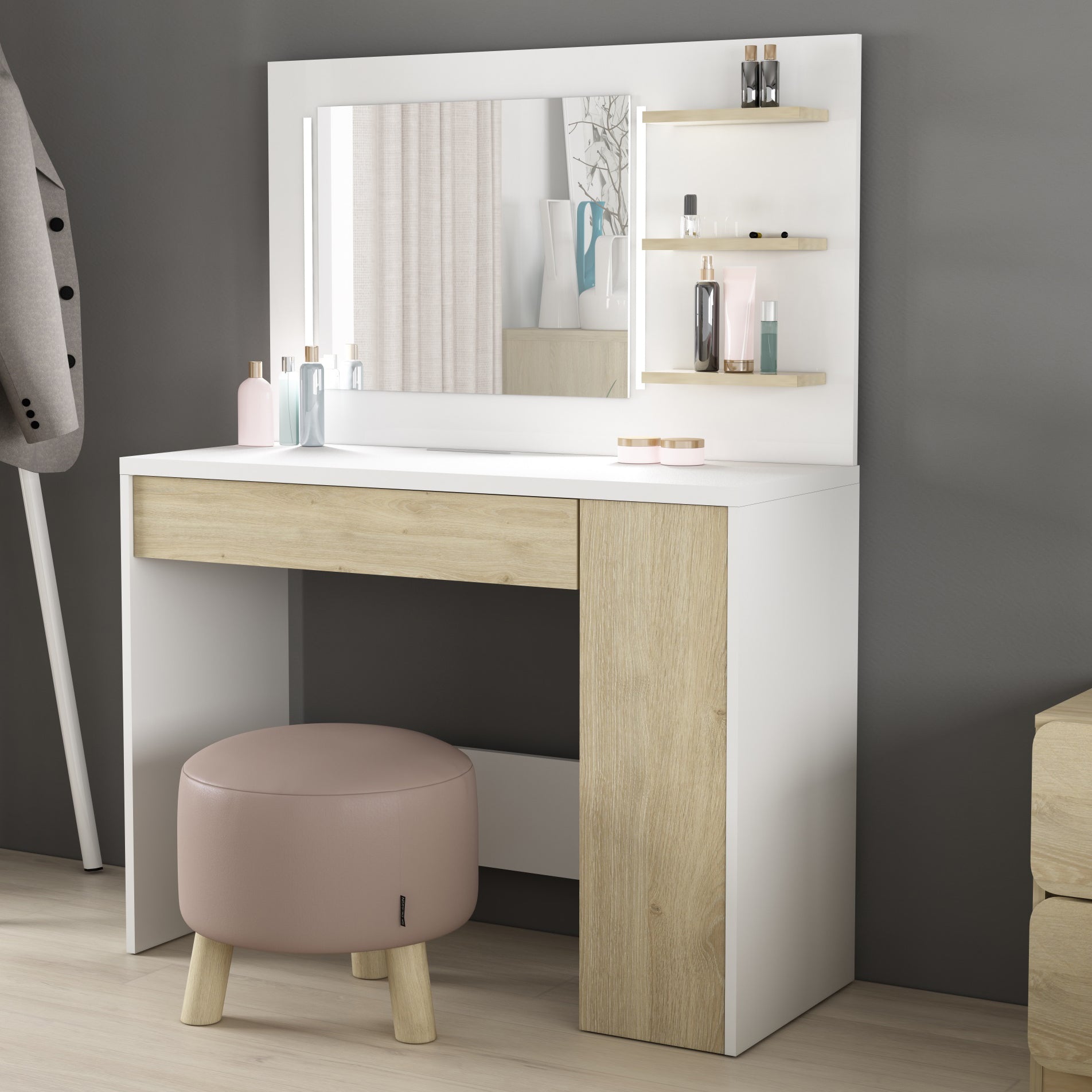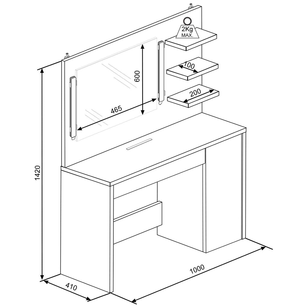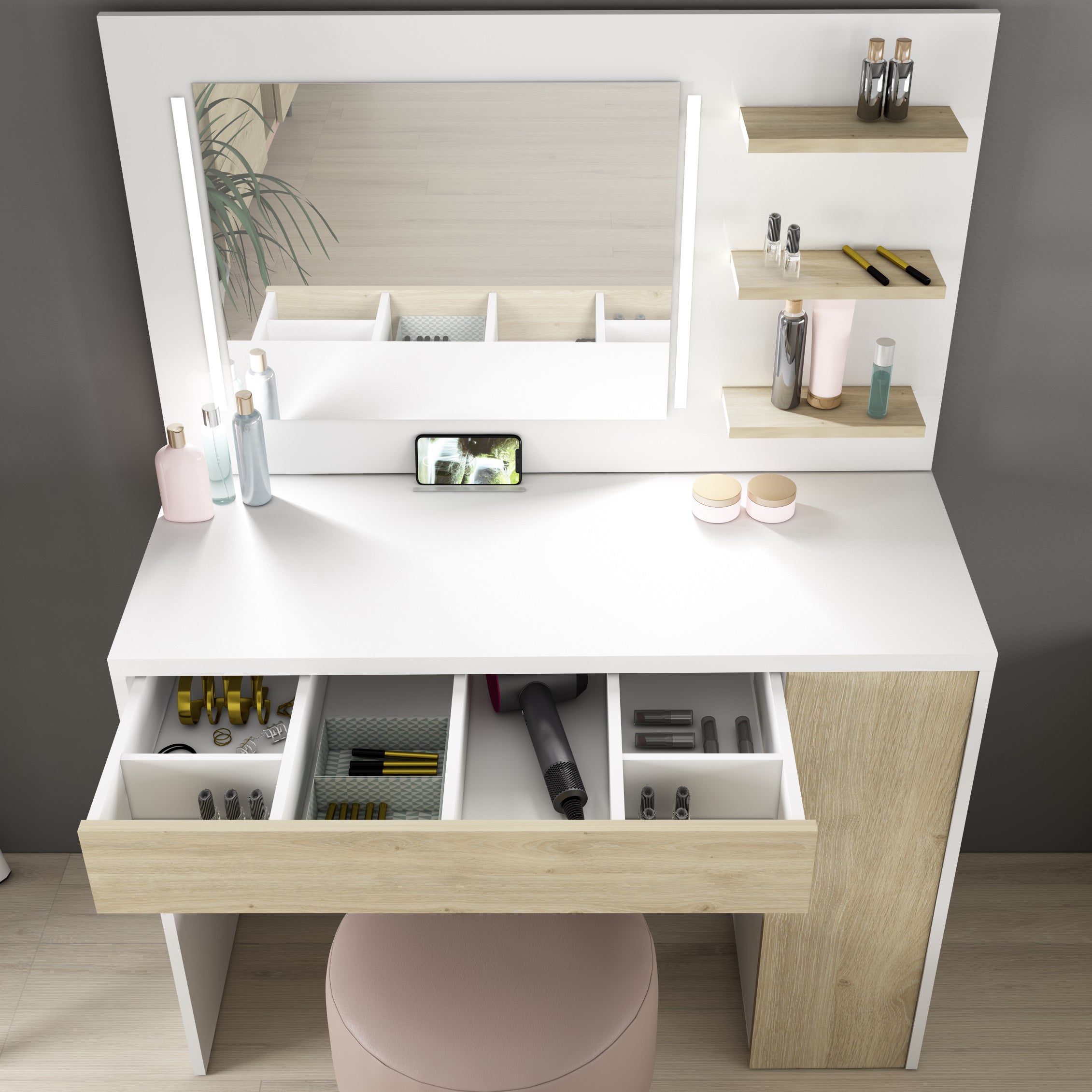 The 60 x 46 cm mirror sits atop a 1M wide shelf, and has dimmable LED strip lights on either side. There's plenty of room on the shelf for cosmetic and scents, and a built-in support bar on the desktop will hold your phone or tablet upright whilst you're busy. There's a wide drawer below with six compartments, and a further pull out drawer on the right with three shelves. This beauty bar offers ample space to keep all the essentials organised and close to hand.