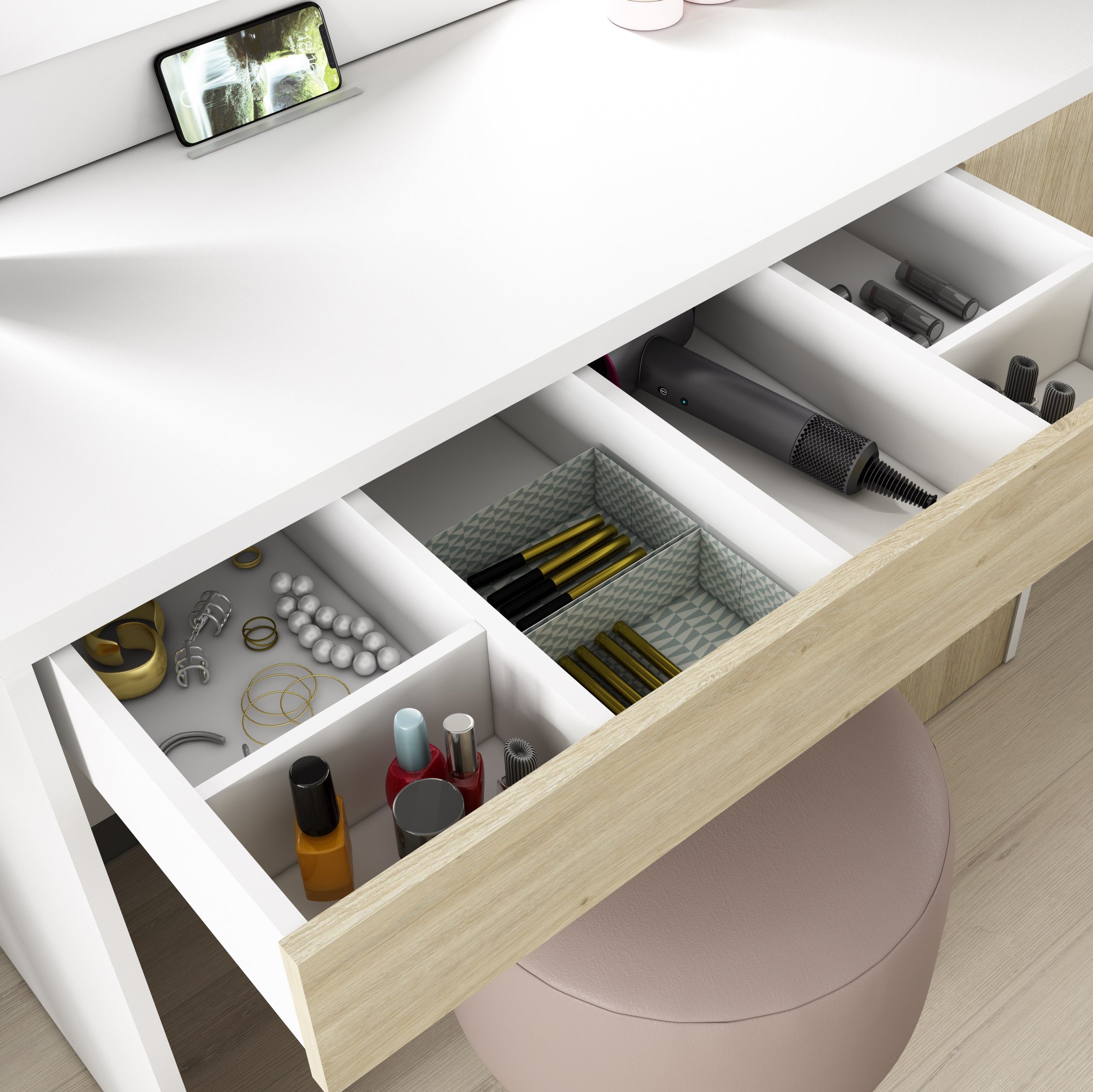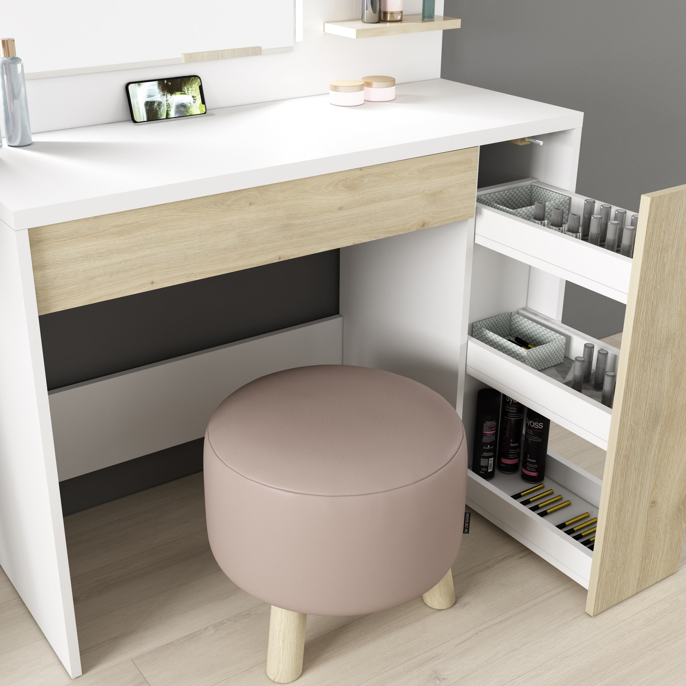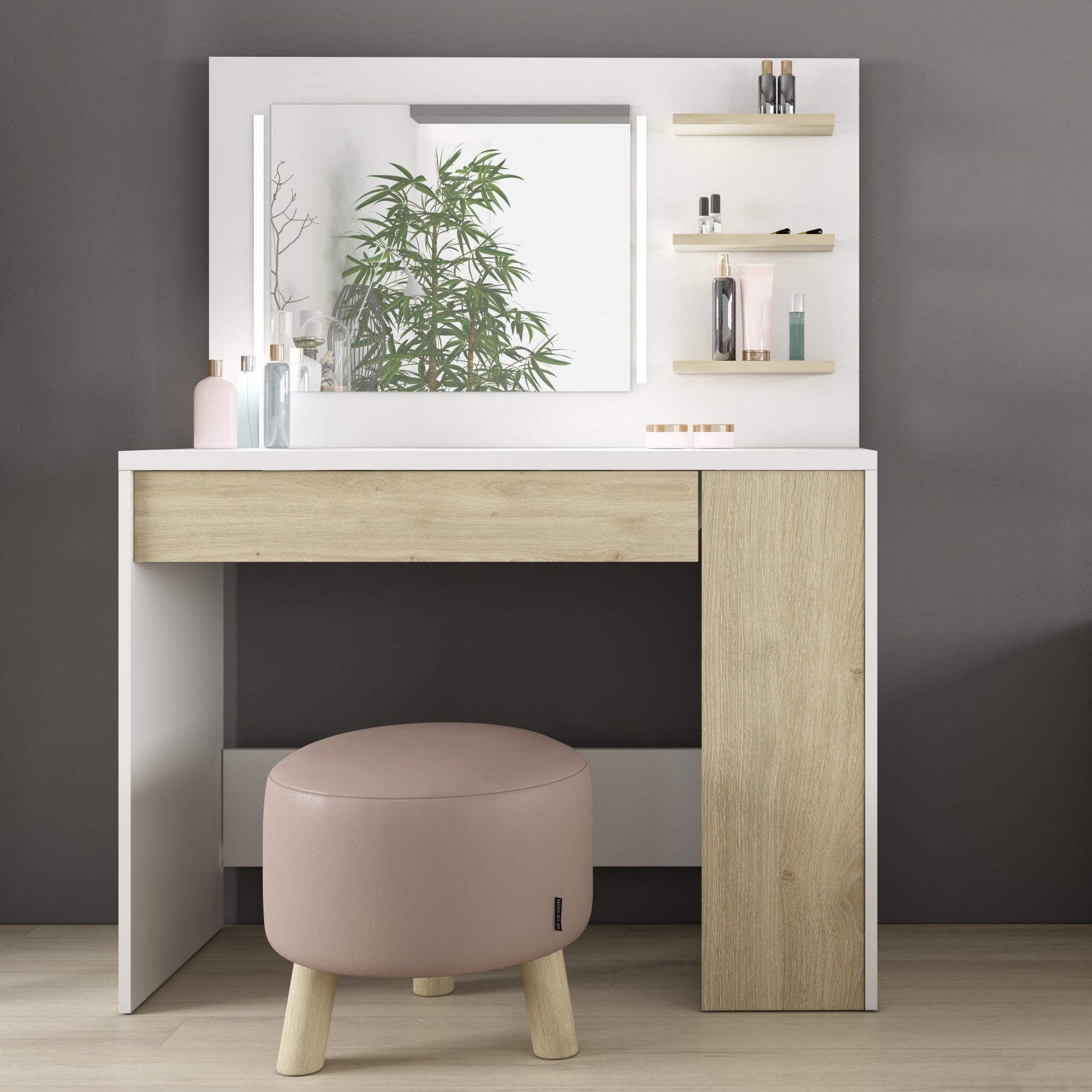 The 60 x 46 cm mirror sits atop a 1M wide shelf, and has dimmable LED strip lights on either side. There's plenty of room on the shelf for cosmetic and scents, and a built-in support bar on the desktop will hold your phone or tablet upright whilst you're busy. There's a wide drawer below with six compartments, and a further pull out drawer on the right with three shelves. This beauty bar offers ample space to keep all the essentials organised and close to hand.