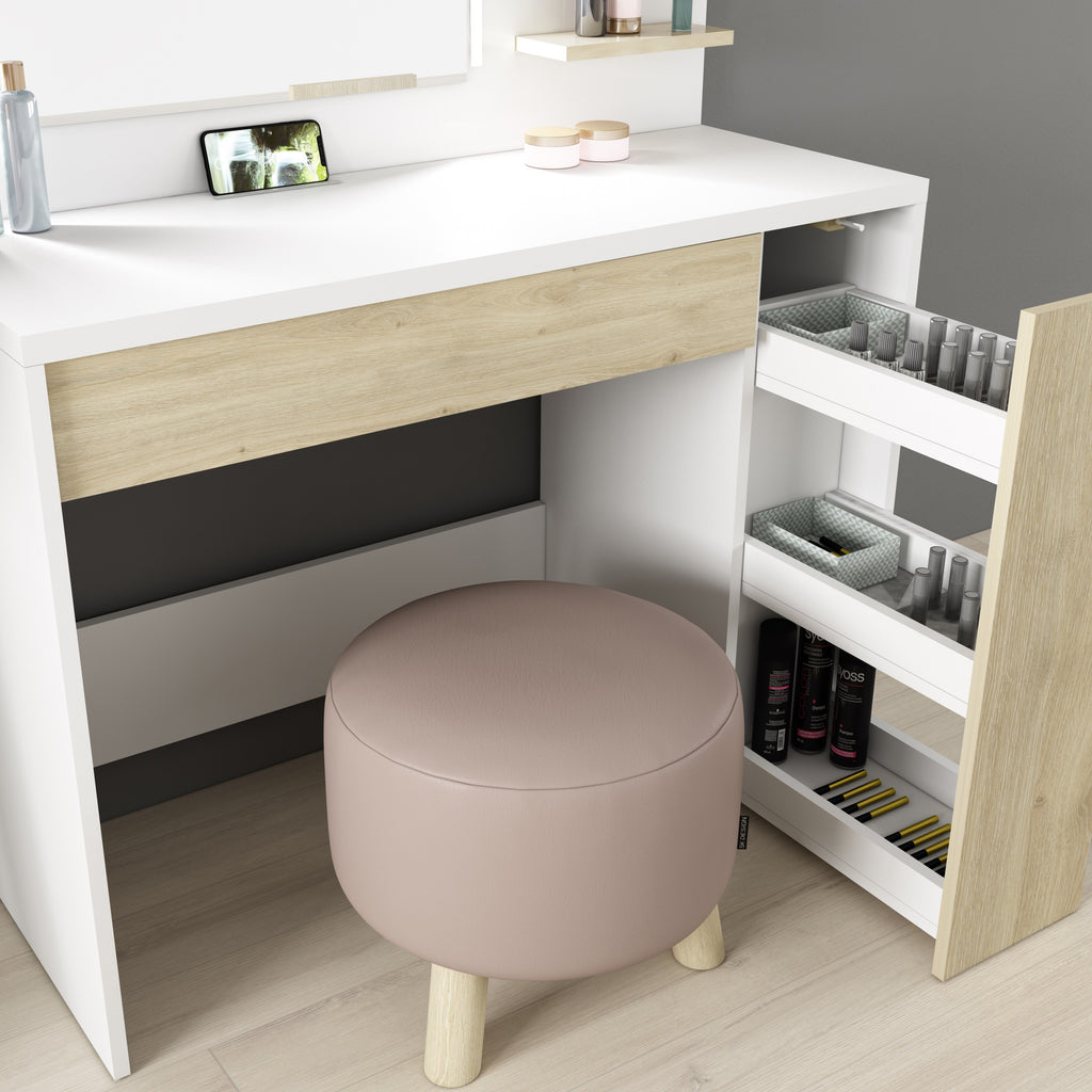 This quality dressing table is made in Spain from modern high density particleboard for a rigid and stable performance, and comes in an attractive white and oak effect finish that makes it work well as a stand-alone bedroom furniture piece.